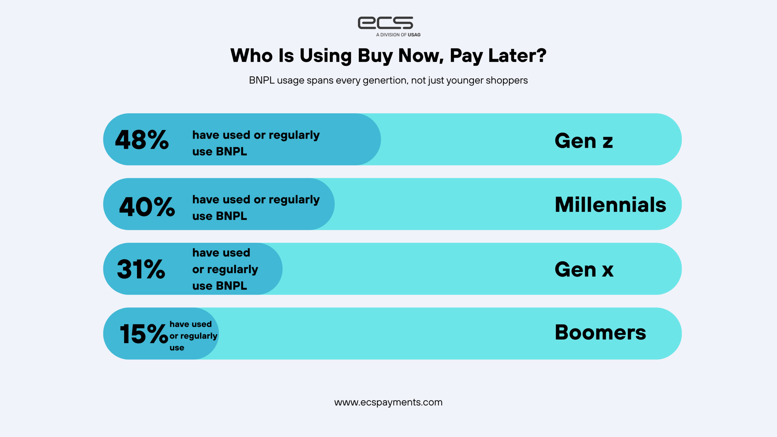 BNPL payments have made significant inroads into consumer behavior. 48% of GenZ shoppers, 40% of millennials, 31% of GenX shoppers, and even 15% of baby boomers have used or regularly used BNPL to make purchases.